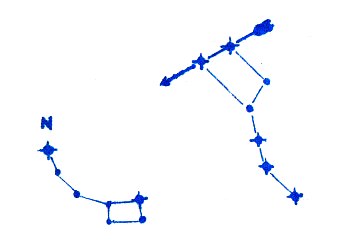 First we need to establish true north. An easy way to find the north pole if you have no compass, is to find the North Star, or pole star. This star is stationary. This star is easy to locate, since the Big Dipper (Ursa Major, meaning The Great Bear - mentioned in the Hebrew Scriptures as "Ash" Job 9:9 margin) has two stars which are called "pointers", they point across the sky to the Pole Star which is in the tip of the handle of the Little Dipper (Ursa Minor, meaning The Little Bear). This is the North Star.